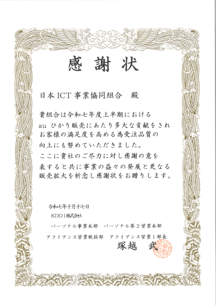 auひかり販売における貢献と、お客様満足度を高める受注品質の向上を評価いただき、KDDI株式会社より感謝状をいただきました(受賞日:2025年7月7日)。