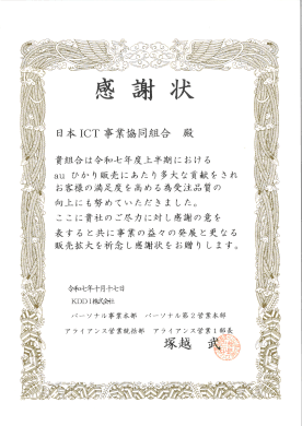 auひかり販売における貢献と、お客様満足度を高める受注品質の向上を評価いただき、KDDI株式会社より感謝状をいただきました(受賞日:2021年10月5日)。